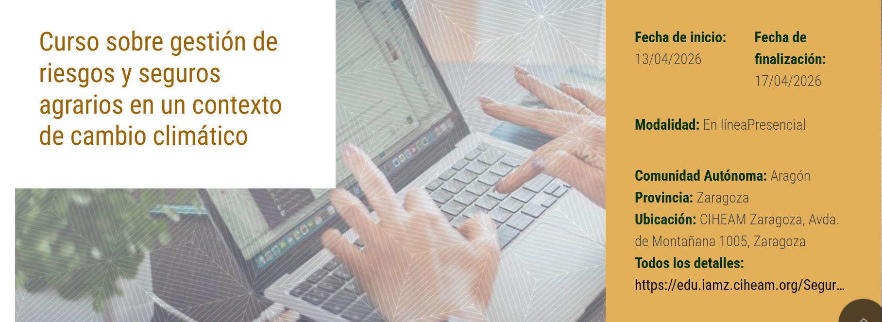 Del 13 al 17 de abril de 2026, el CIHEAM Zaragoza acogerá el curso “Gestión de riesgos y seguros agrarios en un contexto de cambio climático”, una formación especializada que podrá seguirse de forma presencial o en línea y que está dirigida a profesionales implicados en la gestión del riesgo en la agricultura.